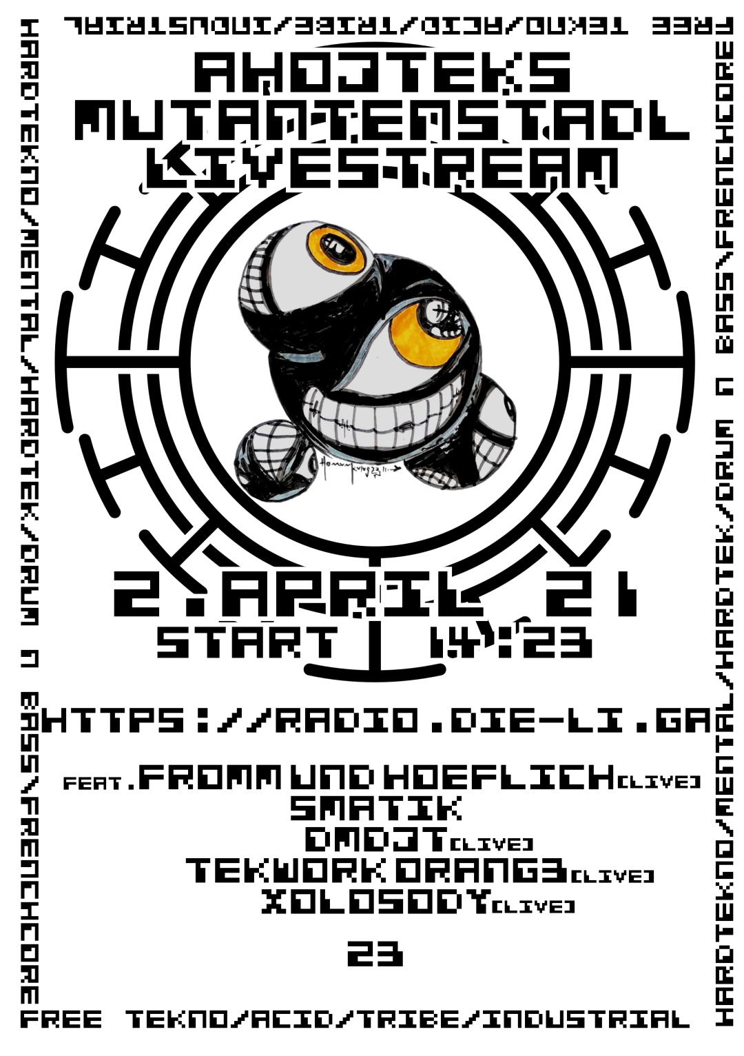 Weiterhin nur, die Mutation unserer Feten zu virtuellen Ereignissen weiter zu treiben! Und deswegen laden wir recht herzlich zu AHOJ TEKs Mutantenstadl, bei dem wir aufwarten werden mit dem Spezialgast Fromm und Hoeflich, mindestens 14 Stunden Tekno, Mental, Frenchcore, Acid, Breakbeats und Industrial live aus unseren Geräten, von den Plattentellern und DJ-Controllern und einer nicht kleinzukriegenden Feierlaune!
