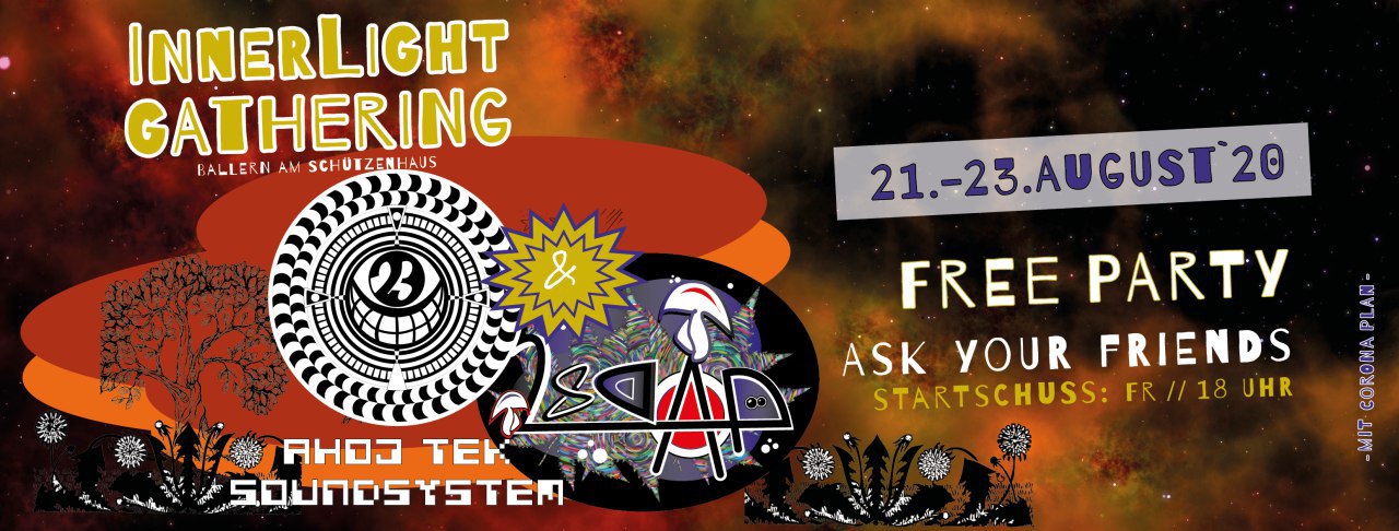 Juhu! Nach dem Ende der seuchenbedingten Streamingsaison haben wir endlich wieder die Gelegenheit, einem Publikum unsere Bässe darzubieten: Das Inner Light Gathering, bei dem zusätzlich zu unserem Geballer noch Dubtech, Goa, Hitech, Drum'n'Base auf 2 Anlagen gespielt werden wird.